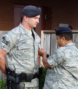 Tech. Sgt. Jeremy McGill fulfilled a childhood dream Friday, Oct 10, when Maj. L.M. Stringer, the 71st Security Forces Squadron commander, presented Sergeant McGill his Security Forces badge. A heavy-equipment operator with the Oklahoma Air National Guard in Tulsa, Sergeant McGill was activated